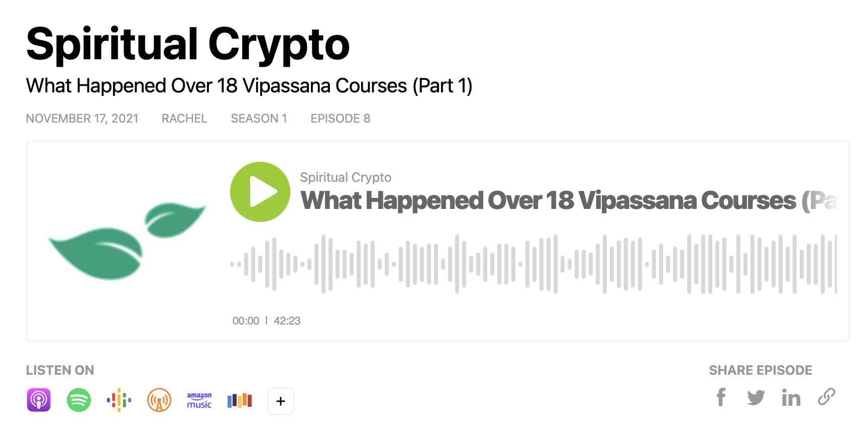 To that end, as of this writing I’ve recorded two Spiritual Crypto podcast episodes walking through my experience at Vipassana courses to date, if you’d like to check them out!